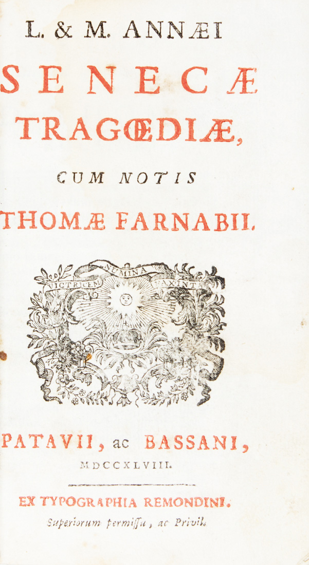 In-8° (mm 185x110). Pagine [16], 855, [33]. Frontespizio figurato inciso in rame. Alcune pagine con leggere fioriture, occasionali macchie e uno strappo senza perdite a carta 2X2, ma nel complesso buone condizioni interne. Legatura in piena pergamena con unghie e titolo manoscritto al dorso. Pecetta in carta moderna fermata da nastro adesivo, sempre al dorso. Nota di possesso manoscritta alla carta di guardia anteriore. SI AGGIUNGE: Seneca Lucius Annaeus, Tragoediae, cum notis Thomae Farnabii. Patavii, ac Bassani: ex typographia Remondini, 1748. In-12° (mm 150x80). Pagine [12], 439, [3] di [5]. Antiporta calcografica. Scompleto dell'ultima carta bianca, con alcune gore e fioriture lungo le carte. Legatura in piena pergamena rigida con titolo manoscritto al dorso. Macchie ai piatti e ulteriore pecetta moderna con collocazione applicata al dorso.(2)