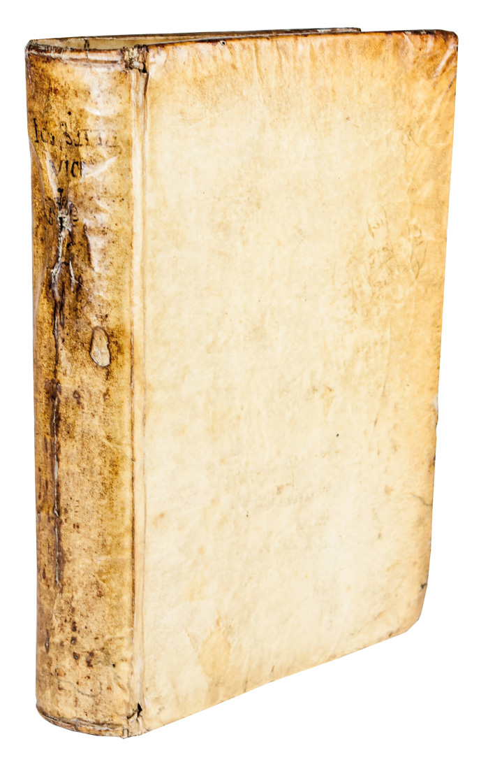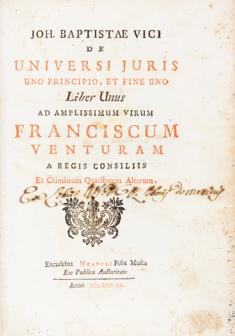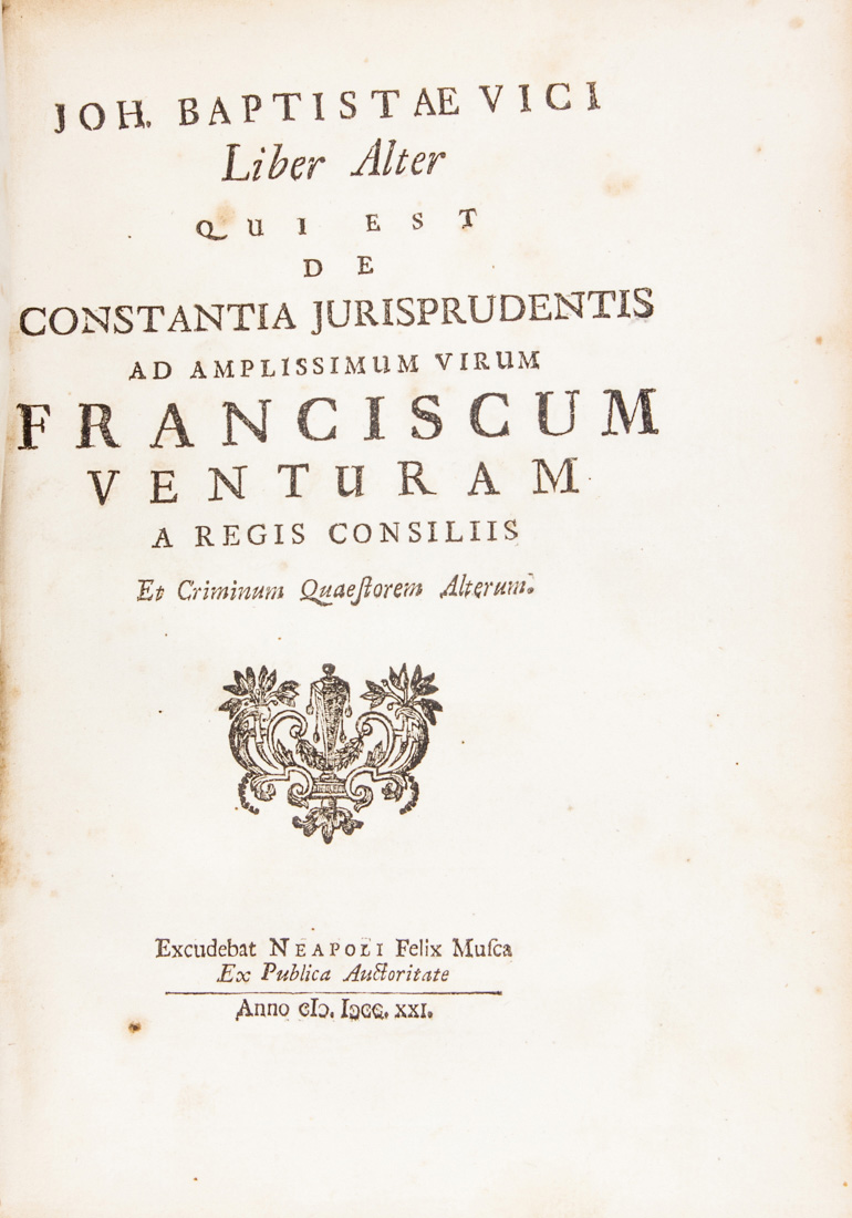 2 opere in 1 volume in-4° (mm 240x168). Pagine [2], 195, 1 bianca. LEGATO CON: Id., Liber alter qui est de constantia jurisprudentis...Neapoli: excudebat Felix Musca, 1720. Pagine [4], 260. Esemplare con arrossature, anche evidenti in alcuni quaderni, fioriture sparse e qualche alone marginale. Frontespizio della prima opera in inchiostro rosso e nero, marca dello stampatore xilografica in entrambi i frontespizi, alcuni capilettera incisi in legno. Legatura coeva in piena pergamena con titoli manoscritti al dorso, con alcune piccole mende riparate. Ex-libris applicato al contropiatto, nota di possesso manoscritta al primo frontespizio, alcune maniculae nel testo.