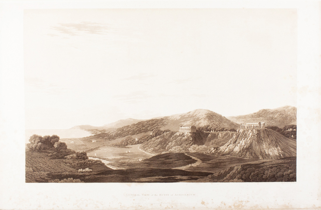 In-folio massimo (mm 578x365). Pagine [6], XXII, 74, [2] con 73 tavole fuori testo di cui 52 in rame e 21 all'acquatinta color seppia. Vignetta calcografica al frontespizio e 14 incisioni in rame o all'acquatinta nel testo. Interamente montato su brachette, con arrossature diffuse e alcuni restauri marginali. Legatura moderna in mezza pelle marrone con punte e piatti in carta marmorizzata, roulette dorata a motivi floreali lungo gli angoli e le cerniere, titoli impressi in oro al dorso.
