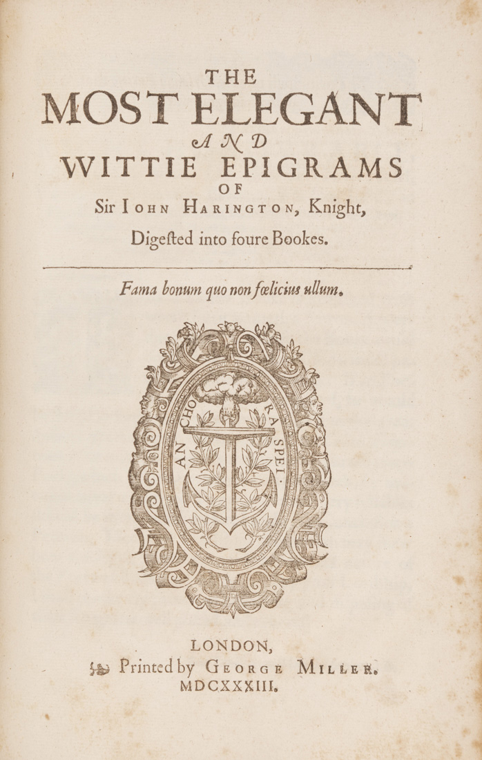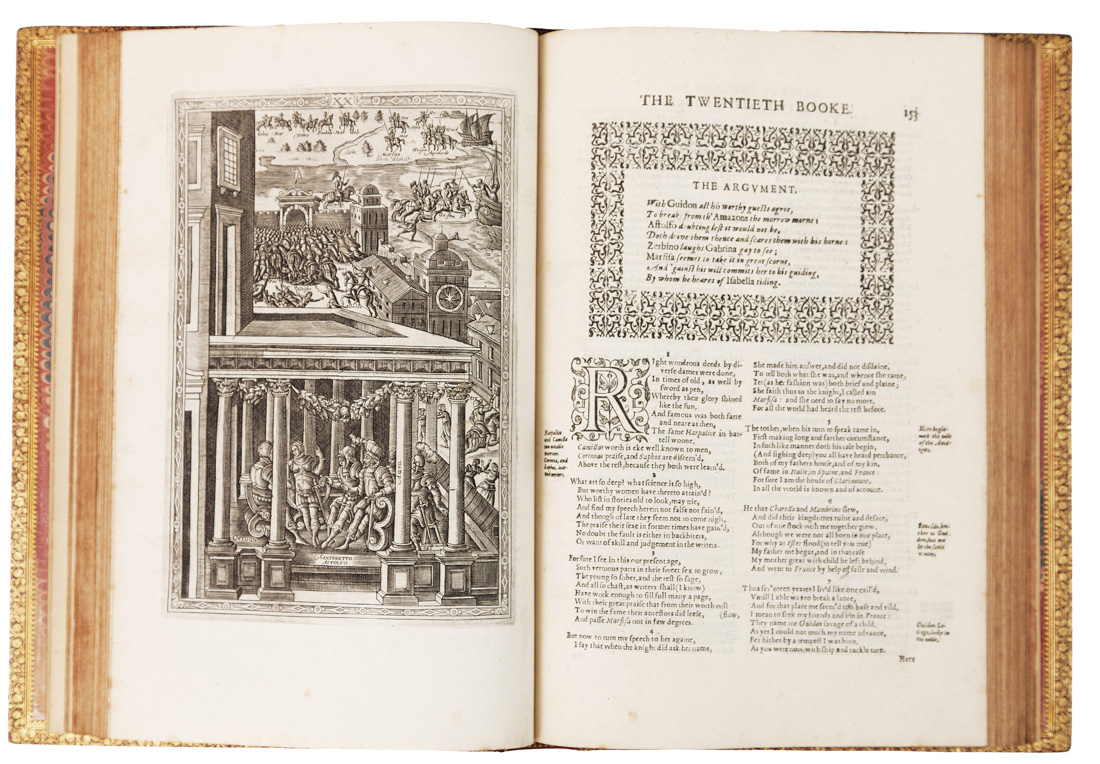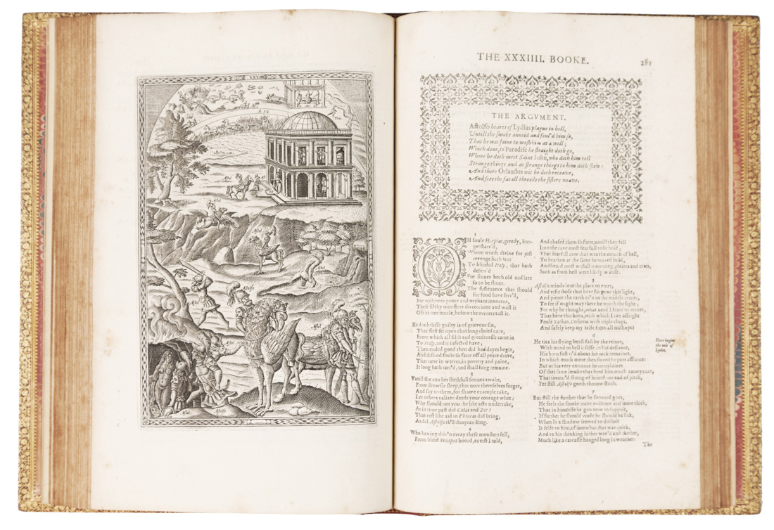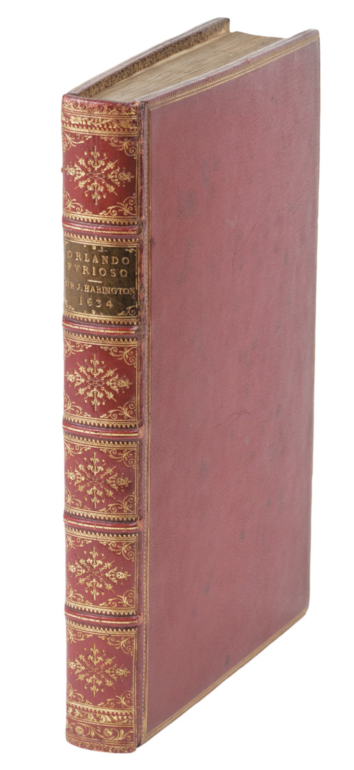 2 opere in 1 volume in-4° (mm 281x186). Pagine 423, [9]. Frontespizio calcografico e 46 tavole incise in rame a piena pagina nel testo. Argomento inserito in ampia cornice xilografica, capilettera filigranati e finalini incisi in legno. Testo a due colonne. Minima lacuna e piccolo strappetto marginali riparati al frontespizio, altro strappo riparato senza perdite a una carta e fioriture lievi e sporadiche passim, per il resto ottima copia. SEGUE: Harington John, The most elegant and witty epigrams... London: printed by George Miller, 1633. Pagine [45], 1 bianca. Ampia vignetta xilografica al frontespizio e belle testatine incise in legno. Qualche fioritura. Bella legatura ottocentesca in pieno marocchino rosso con titolo in oro su tassello al dorso e decorazioni dorate ai comparti, cornice di triplice impressa in oro ai piatti. Lievi macchie. Tre ex-libris inglesi al contropiatto e alla carta di guardia anteriori.