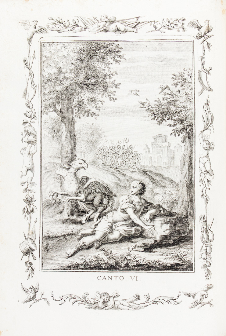 4 volumi in-4° grande (mm 284x205). Carte [1] di frontespizio, [8], pagine LX, carte [150]; [1] di frontespizio, [214]; [1] di frontespizio, [206]; [1] di frontespizio, [268], [1] con 1 antiporta allegorica, 1 ritratto dell'Autore a piena pagina e 56 tavole racchiuse entro cornici rococò il tutto finemente inciso in rame da Zuliani, Fambrini, Leonardis, Malosso e Baratti su disegni di Pietro Antonio Novelli. Ciascun volume con frontespizio calcografico, capilettera, testatine, finalini e graziose bordure per gli Argomenti dei canti, sempre calcografici. Qualche fioritura e macchia sparsa ma nel complesso bella copia. Legatura coeva in piena pelle bazzana marmorizzata con piatti inquadrati da filetto impresso a secco, titoli dorati su tassello e ricche decorazioni in oro ai comparti dei dorsi. Tagli dorati e cesellati. Forellini di tarlo, punte stanche e una piccola rottura alla cerniera di un volume. Ex-libris ai contropiatti.(4)