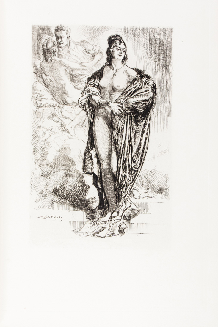 In-4° (mm 302x205). Pagine [10], 86, [8] con 13 acqueforti originali di Lobel-Riche fuori testo, inclusi il ritratto dell'Autore in principio e l'antiporta, tutti protetti da veline con didascalie. Esemplare n. 219, uno dei 415 su vélin d'Arches. Un forellino marginale alle prime carte ma ottima copia. Legatura firmata Codina in pieno marocchino blu con piatti riquadrati da duplice filetto dorato con fregi floreali ai piccoli ferri accantonati interni, titoli dorati al dorso e custodia in cartonato; conservata all'interno la brossura editoriale.