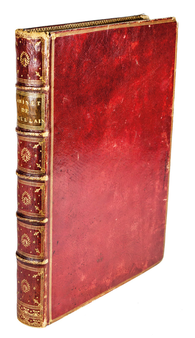 In-4° (mm 285x210). Pagine [6], 22 e 120 illustrazioni in 116 carte di tavole. Fioriture sparse, più evidenti in fine di volume. Legatura coeva in pieno marocchino rosso a grana media con piatti inquadrati da triplice filetto dorato e titoli impressi in oro su tassello al dorso; minimi difetti. Ex-libris Rahir e Moreau applicati al contropiatto e al foglio di guardia anteriore.