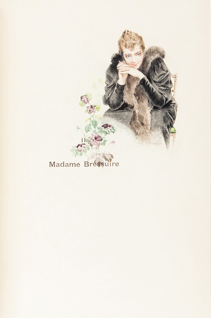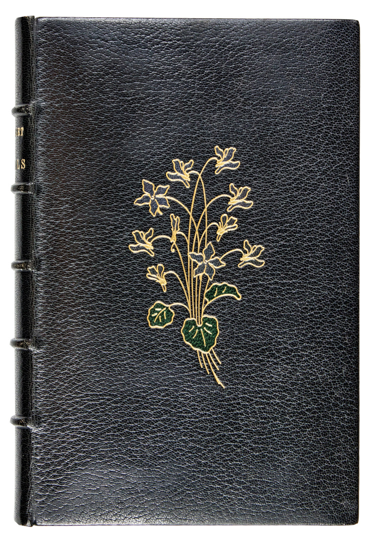 In-8° (mm 242x155). Pagine [8], 330, [2] con 46 acquerelli nel testo a colori. Esemplare n. 130 della tiratura limitata in 200 copie su Japon. Splendida legatura firmata Marius Michel in marocchino nero con grazioso fregio floreale realizzato ad intarsio al piatto anteriore, doublures in marocchino verde con elaborata cornice floreale impressa in oro con inserti in pelle nera e arancione, sguardie in seta; brossura editoriale figurata mantenuta. Ex-libris Henry W. Poor applicato alla carta di guardia anteriore.
