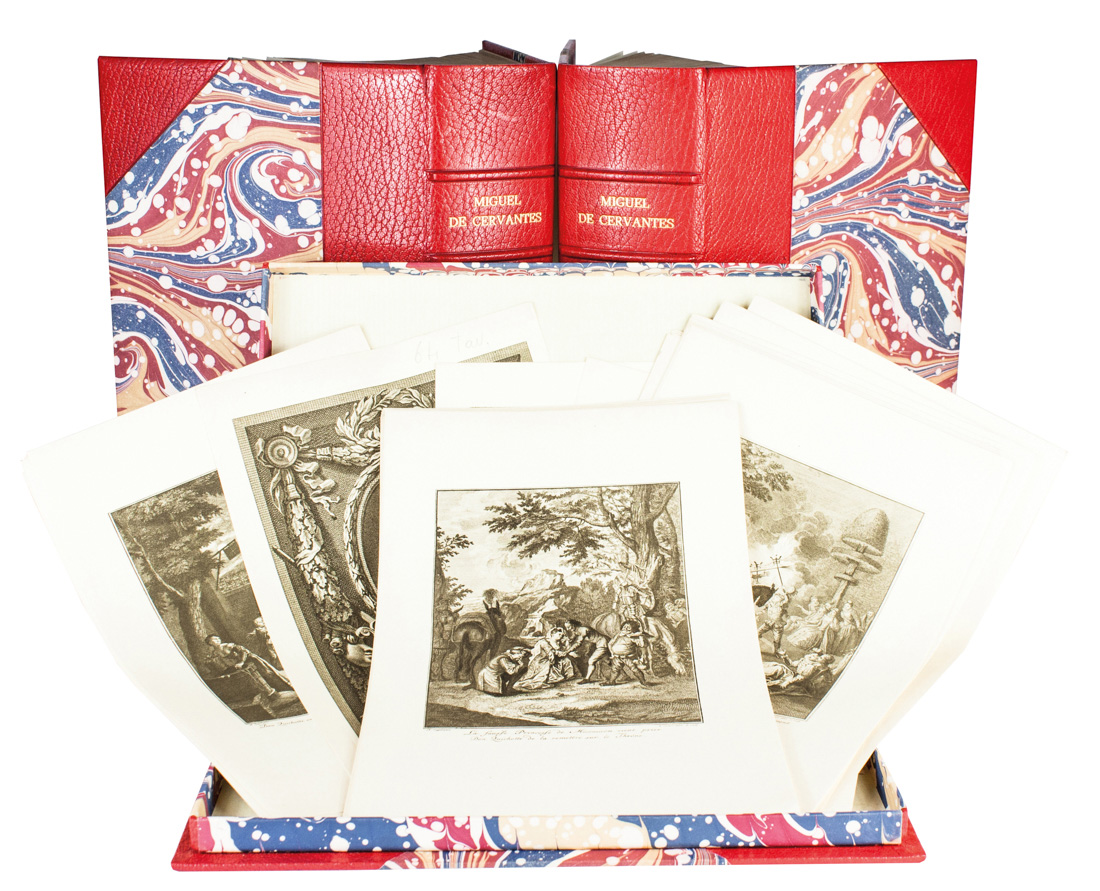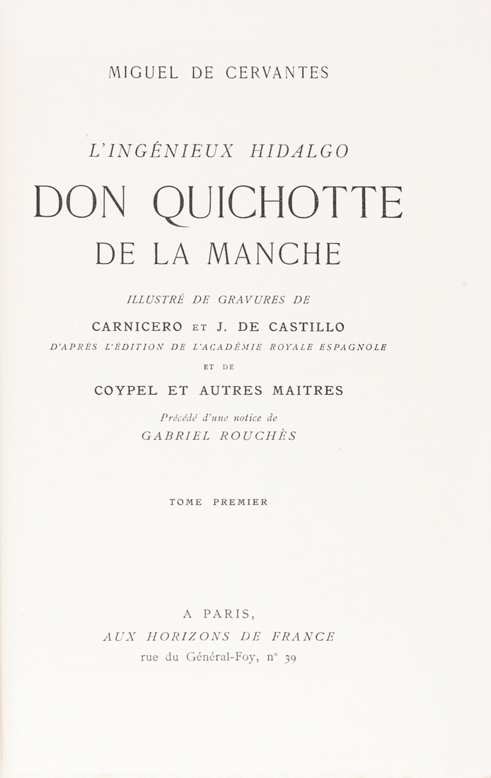 2 volumi in-8° (mm 255x165). Pagine [8], V, [3], 404, [4]; [8], 430, [8]. Con 64 illustrazioni di Coypel, Carnicero e del Castillo finemente incise in rame fuori testo e una suite delle incisioni tirata in bistro conservata a parte. Ottima copia in barbe. Esemplare n. H 100, uno dei 100 della tiratura di testa su vergé de Hollande Van Gelder con una suite a parte delle tavole. Legatura in mezzo marocchino rosso con angoli e piatti marmorizzati per i volumi e per la suite. Mantenuti all'interno i piatti anteriori della brossura editoriale. Insieme al volume lettera di dono al principe Carlo Pacelli datata Madrid 1942.(3)