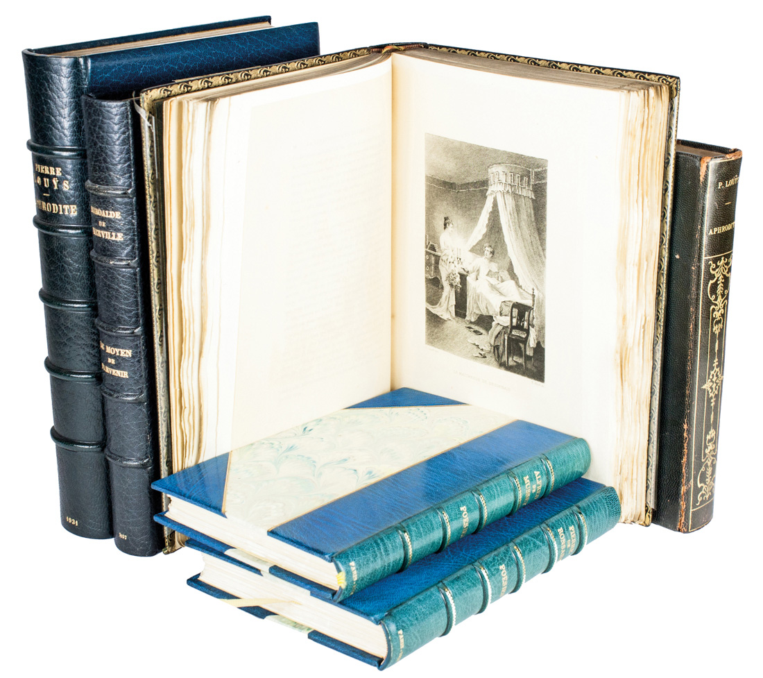 In-8° grande (mm 250x170). Pagine [4], 331, [4], 1 bianca. Frontespizio in nero e rosso con piccola vignetta e 10 tavole fuori testo a piena pagina incise all'acquaforte protette da velina. Bell'esemplare dagli ampi margini. Esemplare n. 198 su una tiratura di 620 copie, uno dei 600 stampati su vergé de Hollande. Legatura in marocchino nero con cornici a motivi fitomorfi impresse in oro ai piatti, titoli e decori dorati al dorso a 5 nervi. Contiene la brossura originale, stampata a colori e in oro. SI AGGIUNGONO: Béroalde de Verville François, Le moyen de Parvenir illustré d'aquarelles et de dessins originaux de Uzelac. Paris: Editions de la belle Étoile, 1937; De Musset Alfred, Poésies. Illustrations de Jacques Pecnard. Paris: Flammarion, 1953; Louÿs Pierre, Aphrodite. Moeurs antiques. Édition illustrée de composition en couleurs de Maurice Ray. Paris: Carteret, 1931; Id., Aphrodite. Moeurs antiques... Paris: Flammarion, 1914; Ronsard Pierre de, Florilège d'amour. Illustrations de André-E. Marty. Paris: Flammarion, 1953.(6)