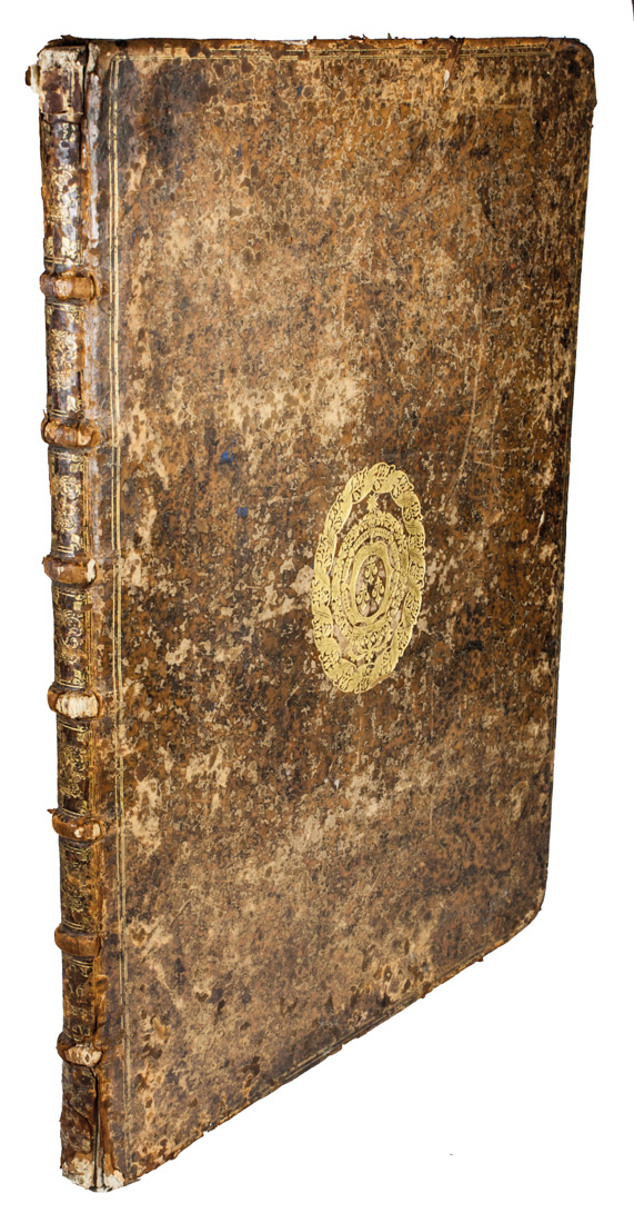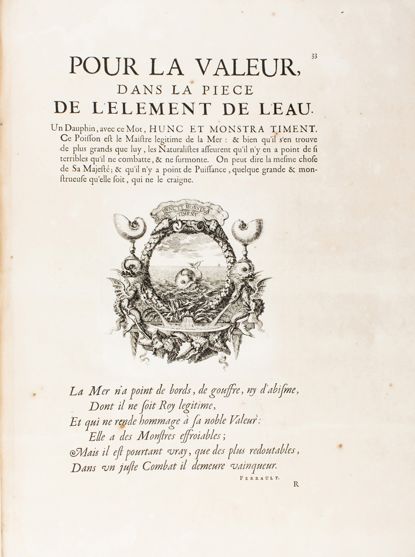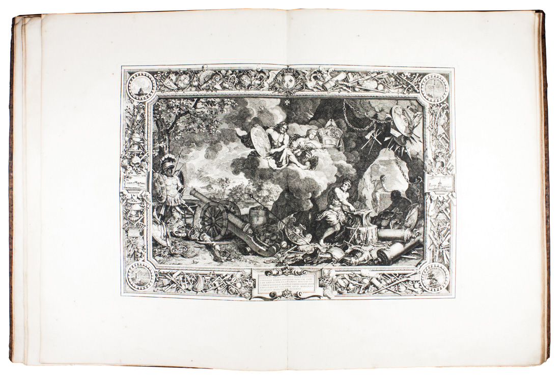 2 parti in 1 volume in-folio (mm 558x420). Pagine [8], 43, [3] bianche; [2], 47, [1] con 8 splendide tavole calcografiche a doppia pagina fuori testo montate su brachette. Antiporta allegorica, frontespizio con grande stemma di Luigi XIV, un'antiporta architettonica per ciascuna delle due parti e moltissime vignette a mezza pagina nel testo, il tutto finemente inciso in rame. Esemplare con parte delle carte leggermente brunite e con un'ampia gora d'acqua lavabile nel margine inferiore delle ultime pagine. Legatura coeva alle armi di Luigi XIV in pieno vitello maculato, con abrasioni, piccole mancanze e altri difetti sia al dorso che ai piatti.