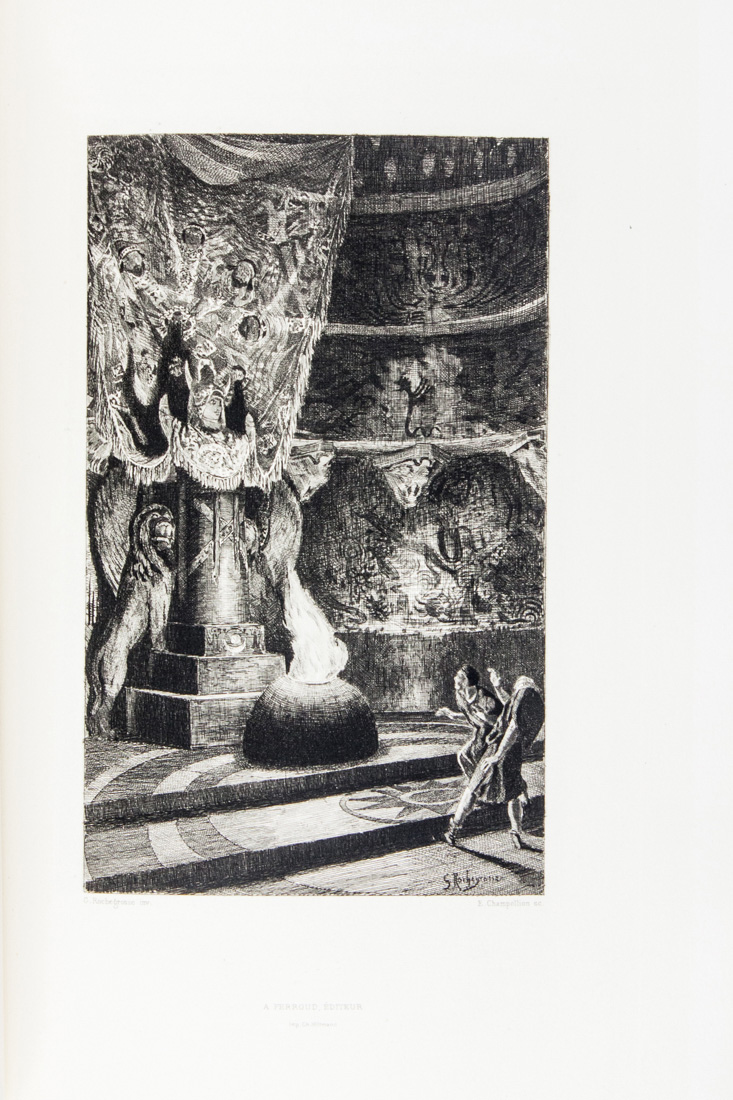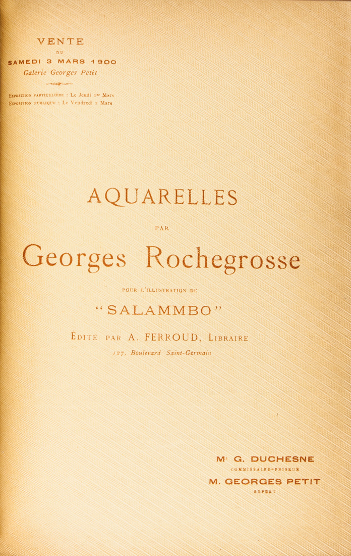 3 opere in 2 volumi in-8° (mm 267x180). Pagine [4], XXIV, 186, [2]; [4], 232, [2] + 21 figure a piena pagina fuori testo e 31 vignette a mo' di testatine e finalini nel testo, per un totale di 52 acqueforti incise da Champollion su disegni di Rochegrosse. Frontespizi in inchiostro rosso e nero, con vignetta incisa. LEGATO CON: Aquarelles par Georges Rochegrosse. Catalogo dell'Asta della Galerie Georges Petit, 3 marzo 1900. Pagine 14 + 2 acqueforti. Esemplare n. 220 su una tiratura complessiva a 600 copie, uno dei 400 su vélin d'Arches. Legatura firmata Durvand in mezzo marocchino nocciola con punte e piatti marmorizzati, filetti dorati ai piatti, titoli e decorazioni floreali in stile Art Nouveau impressi in oro al dorso. Brossure originali conservate all'interno.(2)