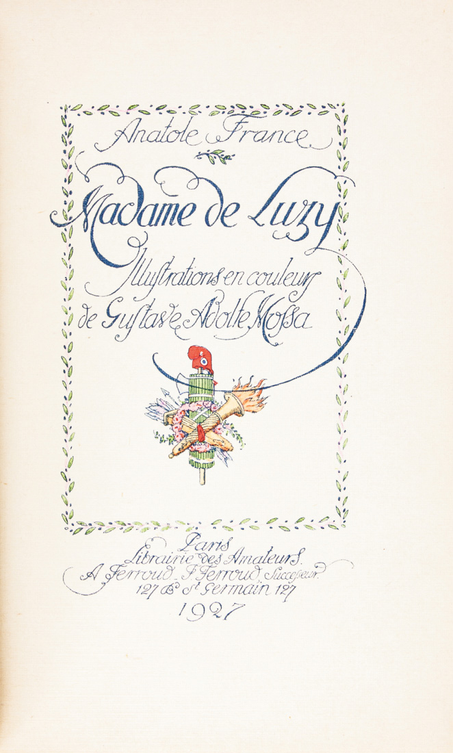 In-8° (mm 190x128). Pagine [10], 38, [2] con 16 illustrazioni di Mossa colorate da Berthelot nel testo anche a piena pagina, di cui una nella brossura, e due suites delle stesse con remarques legate in fine. Esemplare n. 79, uno dei 100 su Japon contenenti 3 stati delle illustrazioni, di cui uno in nero. Legatura in pieno marocchino blu con titoli impressi in oro al dorso e custodia in cartonato, brossura editoriale figurata in tela conservata all'interno. SI AGGIUNGE: Id., Madame de Luzy. Illustrations en couleurs de Gustave Adolphe Mossa. Paris: Ferroud, 1927. In-8° (mm 188x120). Pagine [2], 40, [8] con molte illustrazioni di Mossa colorate da Berthelot nel testo anche a piena pagina, di cui una nella brossura, e una suite in nero con remarques legata in fine. Esemplare n. 160, uno dei 200 in vélin blanc de Rives con due stati delle illustrazioni, di cui uno in nero, su una tiratura a 2000 copie. Legatura in pieno marocchino blu con titoli impressi in oro al dorso e custodia in cartonato, brossura editoriale figurata in tela conservata all'interno.(2)