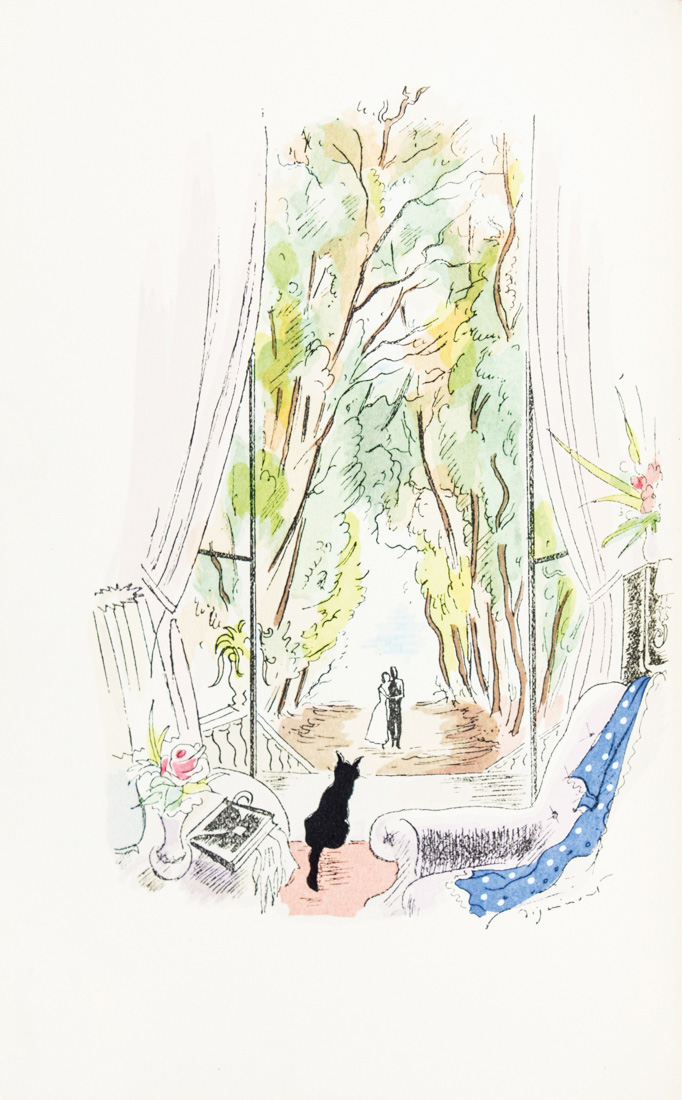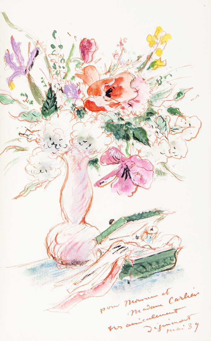 In-8° (mm 190x130). Pagine 166, [2] con 1 antiporta litografica e 32 belle litografie a mezza pagina nel testo di Dignimont, colorate da Charpentier. Esemplare 2550, uno dei 2800 su papier de Voiron, ma impreziosito da un disegno originale di Dignimont con dedica datato 1939. Bella legatura firmata Cauchetier in chagrin color senape con titolo impresso in oro al dorso e al piatto anteriore, sovraccoperta in mezzo chagrin color senape con piatti in carta color ocra, custodia in cartonato rivestita della medesima carta color ocra. Brossura editoriale illustrata a colori conservata all'interno.