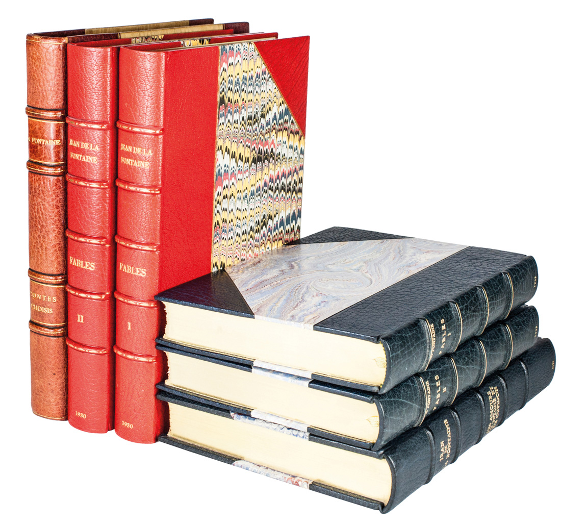 Uno dei 1200 esemplari su vélin de Rives. Legatura in demi chagrin nero con punte e piatti marmorizzati, brossura conservata. SI AGGIUNGE: Id., Fables. Tome I (-II) [...] ornée d'illustrations en couleurs par Joseph Hémard. Paris: Georges Briffaut, 1930. 2 volumi. SI AGGIUNGE: Id., Fables. Illustrations par André Collot. Paris: La belle édition, [1945]. 2 volumi. SI AGGIUNGE: Id., Contes choisis illustrés par Ferraz. Paris: Collection Les Classiques illustrés, s.d. (6)
