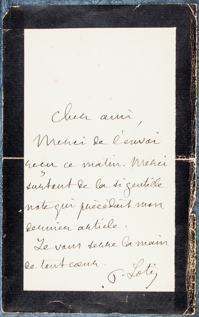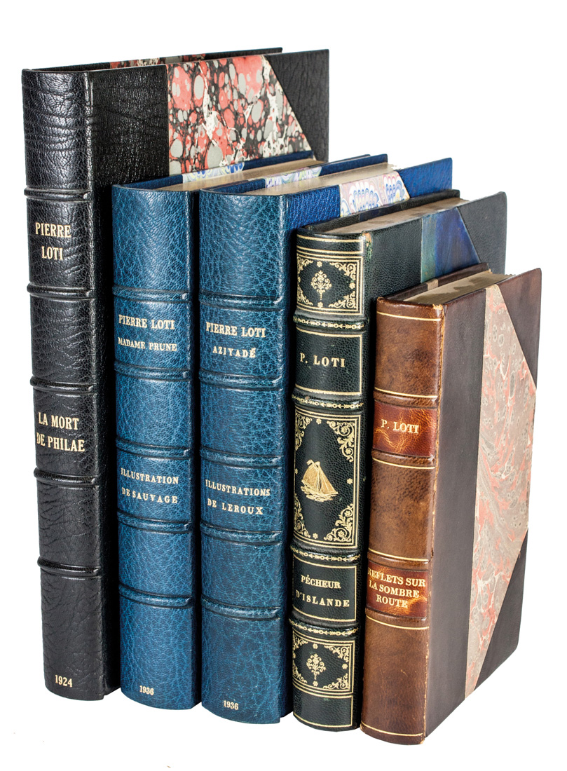 In-12° (mm 182x116). Pagine [2] (di 4, manca l'occhietto), 354. Uno dei 25 esemplari su Japon. Legatura coeva in mezzo marocchino con punte, titoli dorati entro tassello al dorso. Copia impreziosita dalla dedica autografa dell'Autore applicata al foglio di sguardia anteriore. SI AGGIUNGE: Id., Pecheur d'Islande, avec des gravures sur cuivre de Daragnès. A Paris: éditions de la banderole, 1922. Uno dei 900 esemplari su vélin de Rives. Legatura coeva in mezzo marocchino. SI AGGIUNGE: Id., La morte de Philae. Illustré de vingt eaux-fortes de Géo Colucci. Paris: René Kieffer, 1924. SI AGGIUNGE: Id., La troisième jeunesse de Madame Prune. Illustrations de Sylvain Sauvage. [Paris]: Calmann-Lévy, 1936. SI AGGIUNGE: Id., Aziyadé. Illustrations d'Auguste Leroux. [Paris]: Calmann-Lévy, [1936].(5)