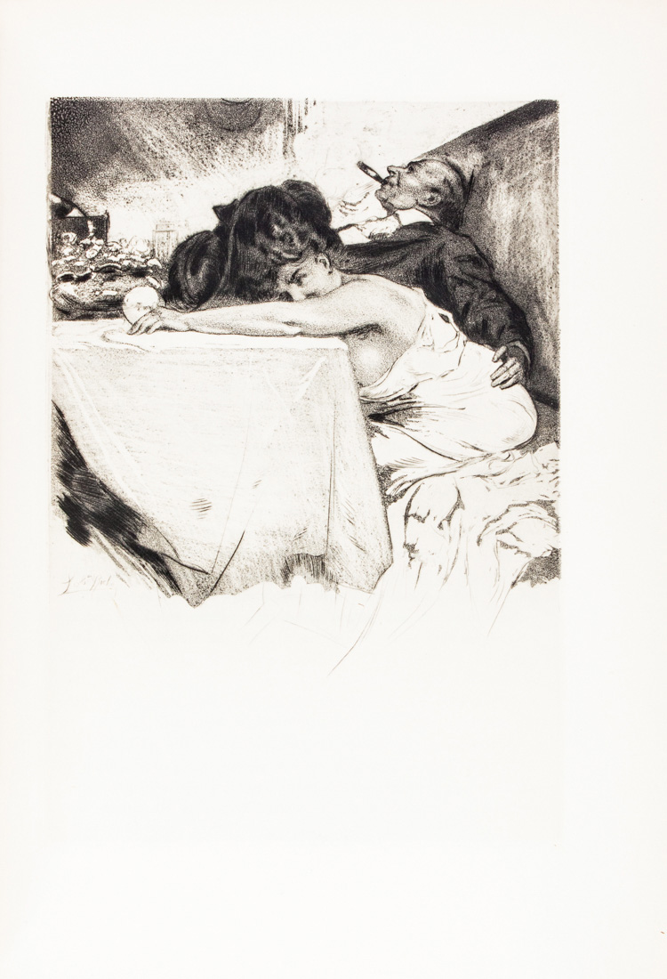 In-4° (mm 338x250). Pagine [8], 121, [5] con 40 incisioni all'acquaforte e punta secca fuori testo di Lobel-Riche protette da veline con didascalie in rosso. Esemplare n. 60, uno dei 73 su Japon ma senza la suite delle tavole con remarques, su una tiratura di 250 copie. Legatura firmata Casciani in pieno marocchino nocciola con cornice geometrica di fasci di filetti ai piatti e titoli al dorso impressi in oro, doublures in marocchino e seta, con ampia dentelle impressa in oro, sguardie in seta; con la brossura editoriale figurata conservata. Dorso ricostruito e altri piccoli difetti.