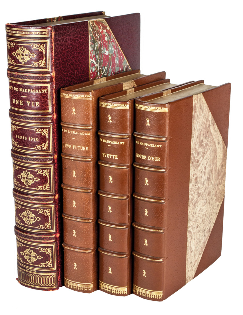 In-8° (mm 264x174). Pagine [8], 310, [2] con 38 illustrazioni originali nel testo di Leloir incise a bulino e all'acquaforte da Boisson, in tre stati. Esemplare n. 23 su vélin du Marais, uno degli 80 della tiratura di testa su Japon e vélin con due suites delle illustrazioni, di un'edizione limitata a 300 copie. Legatura firmata René Aussourd in mezzo marocchino rosso con punte, titoli e fregi impressi in oro al dorso, brossura originale conservata all'interno; lievi abrasioni alle cerniere. SI AGGIUNGONO: Id., Notre coeur. Paris: Calmann-Lévy, 1926; Id., Yvette. Paris: Calmann-Lévy, 1928; Villiers de l'Isle-Adam, L'Ève future. Gravures de Drouart. Paris: Henri Jonquières, 1925.(4)