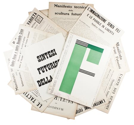 In-4° grande (mm 330x245). Pagine 16. Gora d'acqua e macchie d'inchiostro lungo il margine inferiore. Copertina originale a due colori di Saladin. SI AGGIUNGONO: Manifeste du futurisme. Milano: Direction du mouvement futuriste, 1909. Manifesto dei Musicisti Futuristi. Milano: Direzione del Movimento Futurista, 1910. Manifeste technique de la littérature futuriste. Milano: Direction du mouvement futuriste, 1912. Le Futurisme et la Philosophie. Milano: Direzione del Movimento Futurista, 1912. Manifesto tecnico della scultura futurista. Milano: Direzione del Movimento Futurista, 1912. Manifesto tecnico della letteratura futurista. Milano: Direzione del Movimento Futurista, 1912. Supplemento al Manifesto tecnico della letteratura futurista. Milano: Direzione del Movimento Futurista,1912. Contro Roma e contro Benedetto Croce. Milano: Direzione del Movimento Futurista, 1913. L'arte dei rumori. Milano: Direzione del Movimento Futurista, 1913. L'immaginazione senza fili e le parole in libertà. Milano: Direzione del Movimento Futurista, 1913. Il teatro di varietà. Milano: Direzione del Movimento Futurista, 1913. L'antitradizione futurista. Milano: Direzione del Movimento Futurista, 1913. Sintesi futurista della guerra. Milano, Direzione del Movimento Futurista, 1914. Il futurismo giudicato da una grande rivista francese. Milano: Direction du mouvement futuriste, 1920. Le tactilisme. Milano: Direction du mouvement futuriste, 1921.(16)