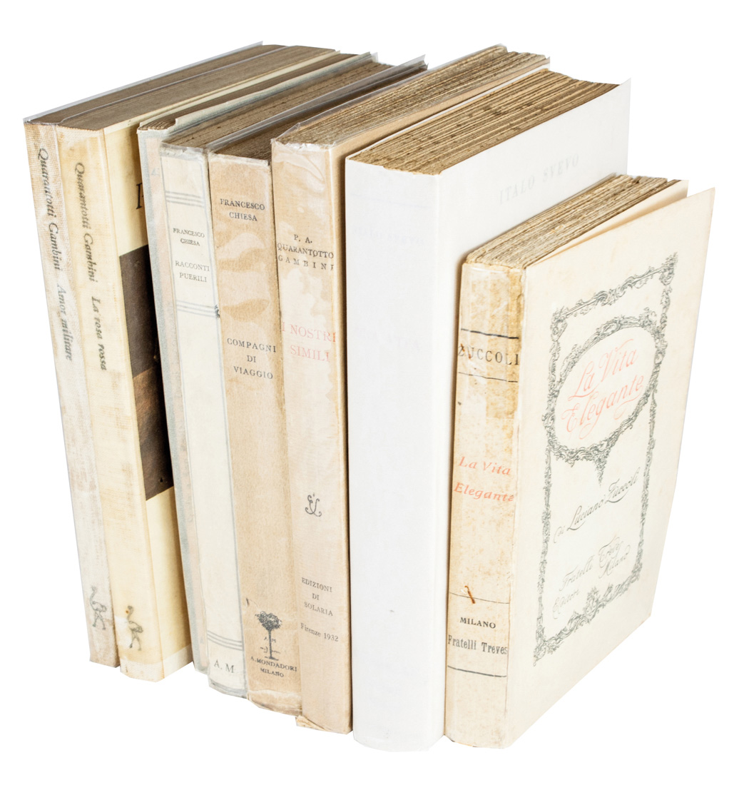 In-8° (mm 190x125). Pagine 402. Esemplare intonso e in barbe. Lievemente brunito e con sporadiche fioriture. Brossura editoriale con titolo al dorso e al piatto anteriore. Macchie e minime mancanze ai piatti. SI AGGIUNGONO: Chiesa Francesco, Compagni di viaggio. Milano: Mondadori, 1931. Id., Racconti puerili. Milano: Mondadori, 1935. Gambini Quarantotto, I nostri simili. Firenze: Solaria,1932. Id., Amor militare. Torino: Einaudi, 1955. Id., La rosa rossa. Torino: Einaudi, 1960. Incoronato Luigi, Scala a San Potito. Milano: Mondadori, 1950. Zuccoli Luciano, La vita elegante. Milano: Treves, 1925.