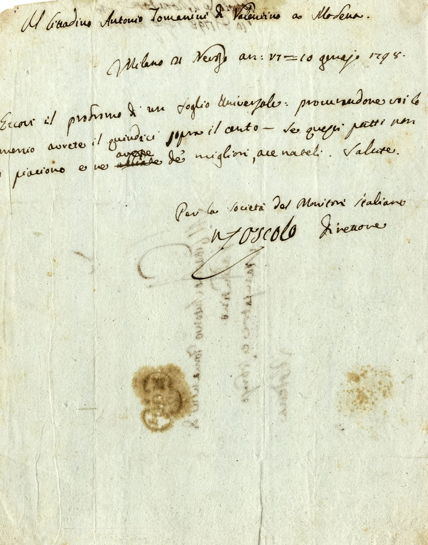 Foscolo Ugo, Lettera autografa firmata inviata ad Antonio Tomanini di Valentino a Modena.