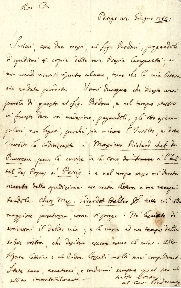 Pindemonte Ippolito, Lettera autografa firmata ad [Angelo Mazza ?]. Datata 23...