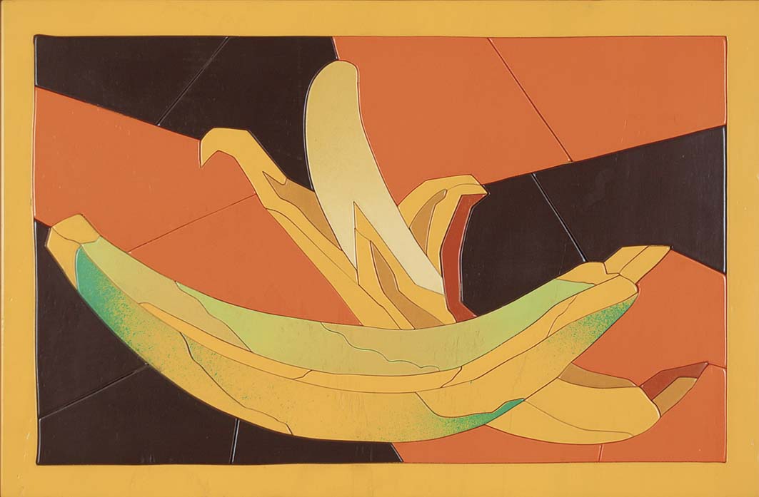 NESPOLO UGO Mosso Santa Maria (Vc) 1941 Tutti Frutti acrilici su legno intarsiato Misure: 39,5x60,5 firma al retro autentica dell'Autore su foto provenienza Studio Nespolo - etichetta al retro