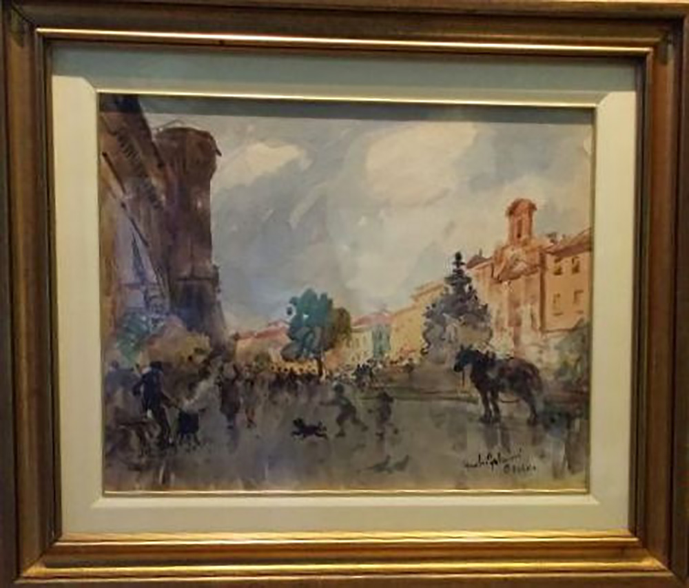 "Il mercato di Cesena" - Acquarello su cartone - cm 50x60 -Firma in basso a dx e sul retro - Certificazione Galleria Pedrani Milano
