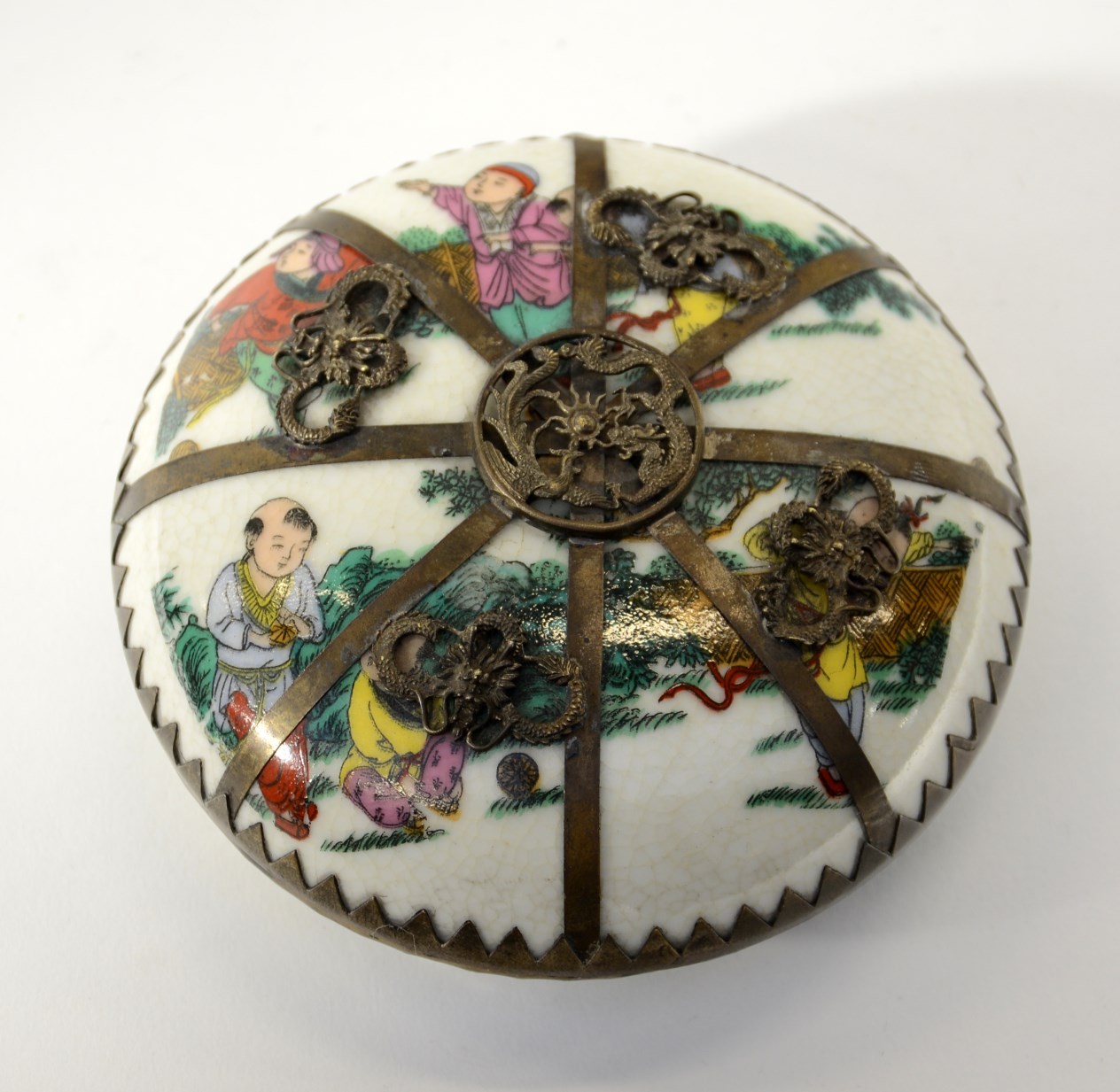 Lot 5 | Piccola scatola in porcellana con inserti in metallo, marchio alla base,...