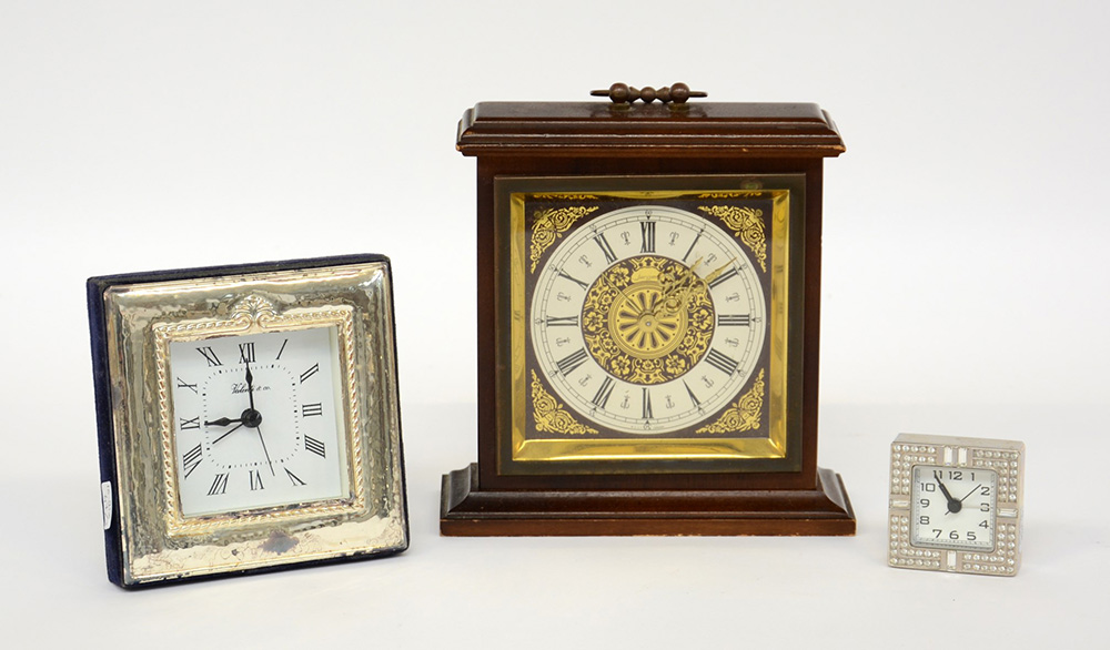 Lotto composto da tre orologi da tavola, uno in lamina d'argento, uno con cassa in legno e uno con cassa in metallo argentato