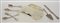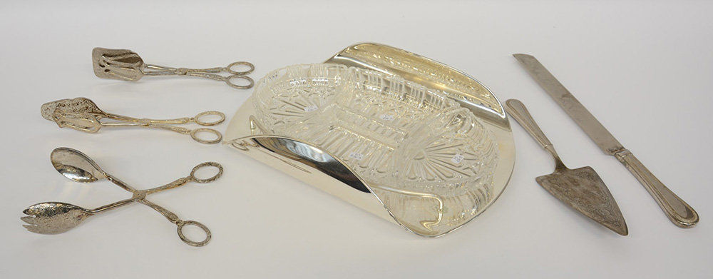 Lotto composto da una raviera in metallo argentato e vetro, Prod. Cassetti Firenze, e da cinque posate da portata in metallo argentato