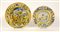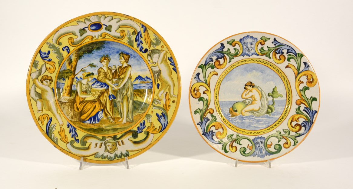 Lotto composto da due piatti in maiolica policroma raffiguranti nereide su delfino e tre muse decorati alla maniera dell' antico, misure diverse (difetti)