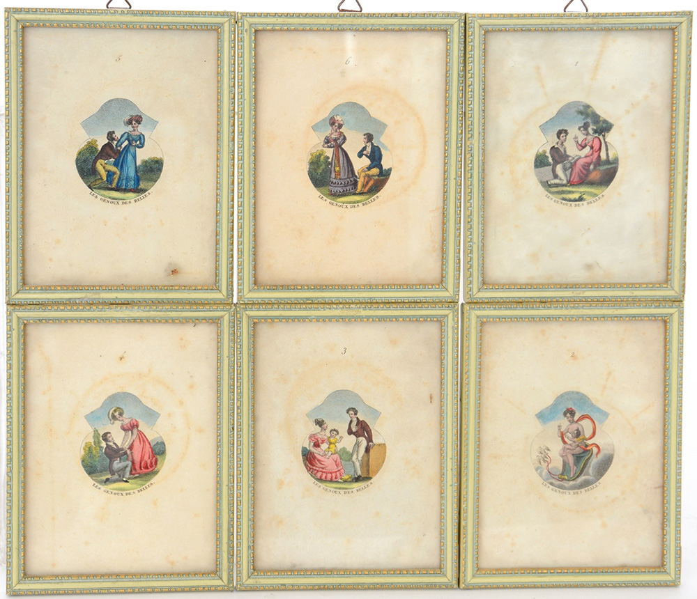 Lot 32 | Lotto di sei piccole incisioni colorate raffiguranti scene galanti (cm 12x9)...