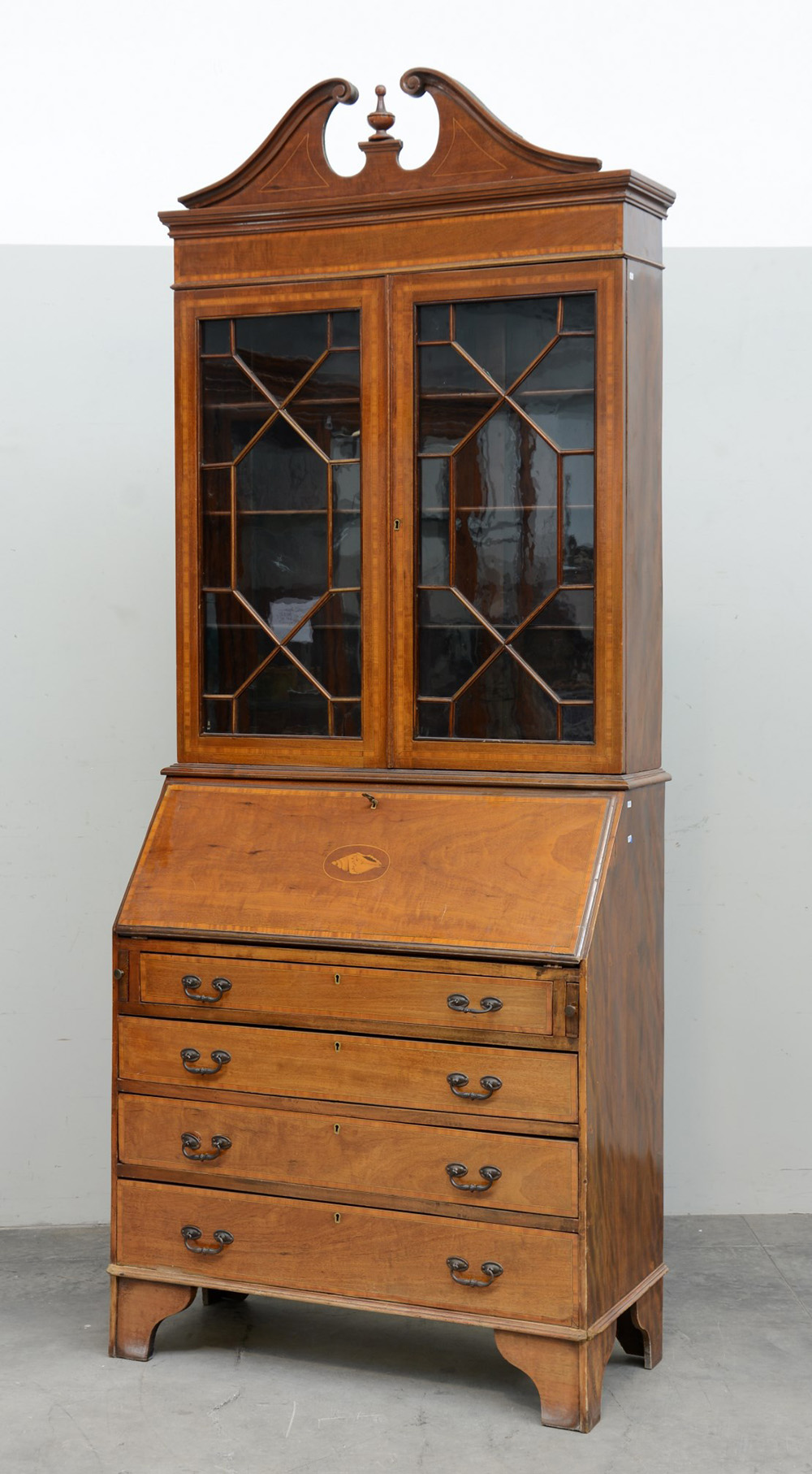 Mobile a due corpi in mogano, parte superiore a due ante a vetri decorata da listelli, parte inferiore a quattro cassetti e antina ribaltabile celante cassettini e vani. Cimasa sagomata. Inghilterra fine sec. XIX (cm 90x222x39)