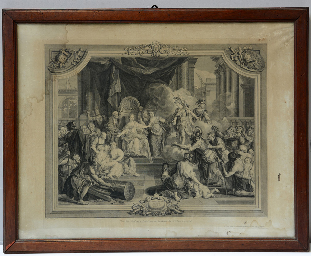 Incisione intelata del sec. XVIII raffigurante scena storica da Coypel (difetti e mancanze)