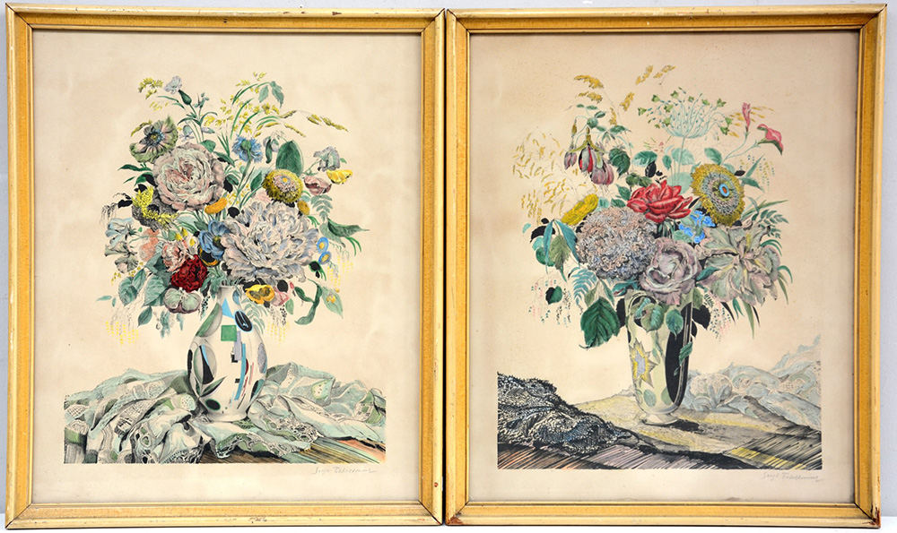Coppia di stampe a colori raffiguranti vasi con fiori. In cornici