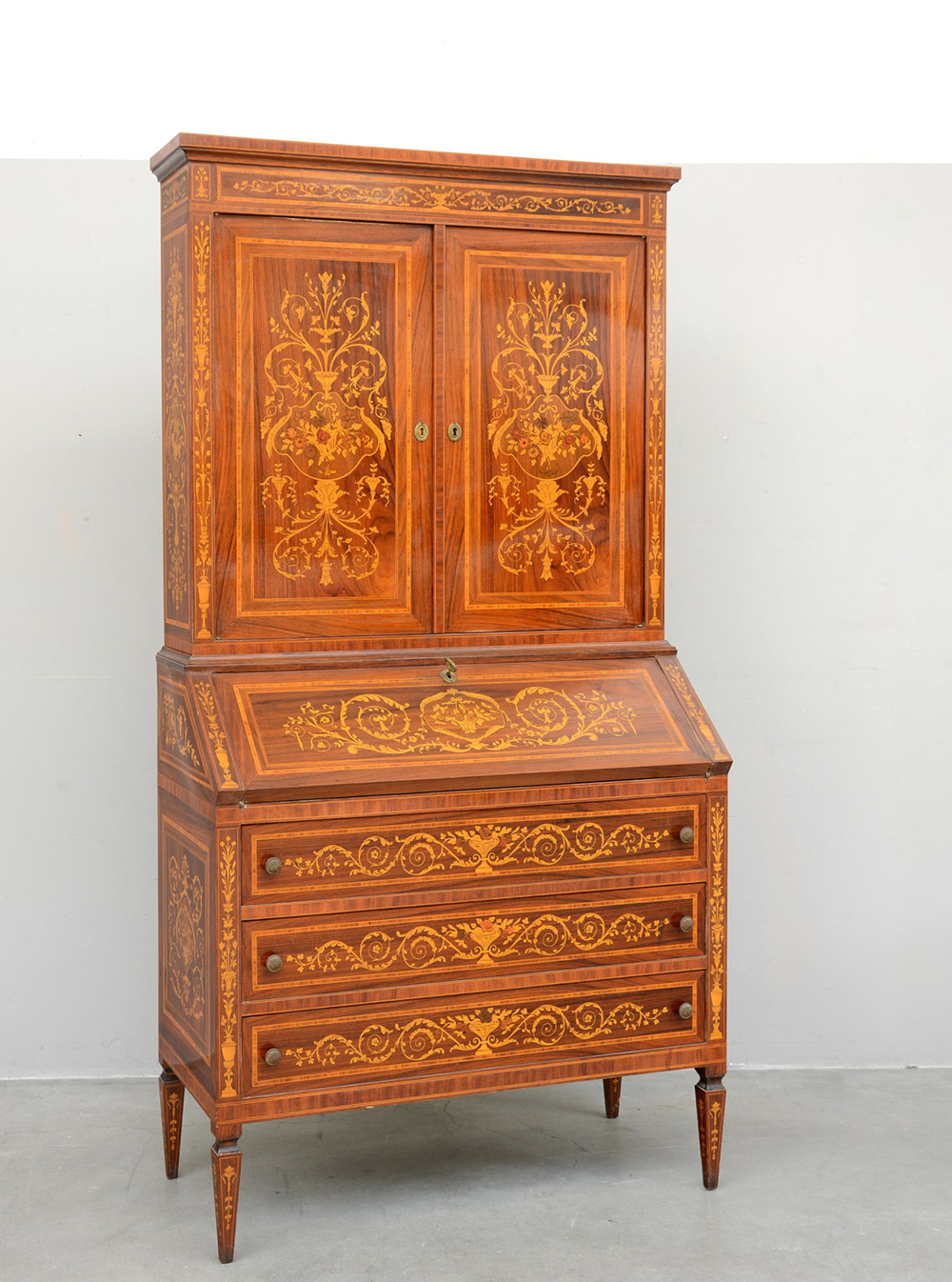Mobile a due corpi in legno impiallacciato e intarsiato a motivi floreali, con ribalta e tre cassetti nella parte inferiore e due battenti nell'alzata, piedi rastremati (cm 100x196x49) (difetti)