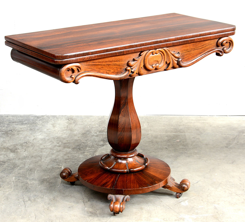 Tavolo da gioco con piano a libro, fascia intagliata a volute, gamba centrale...