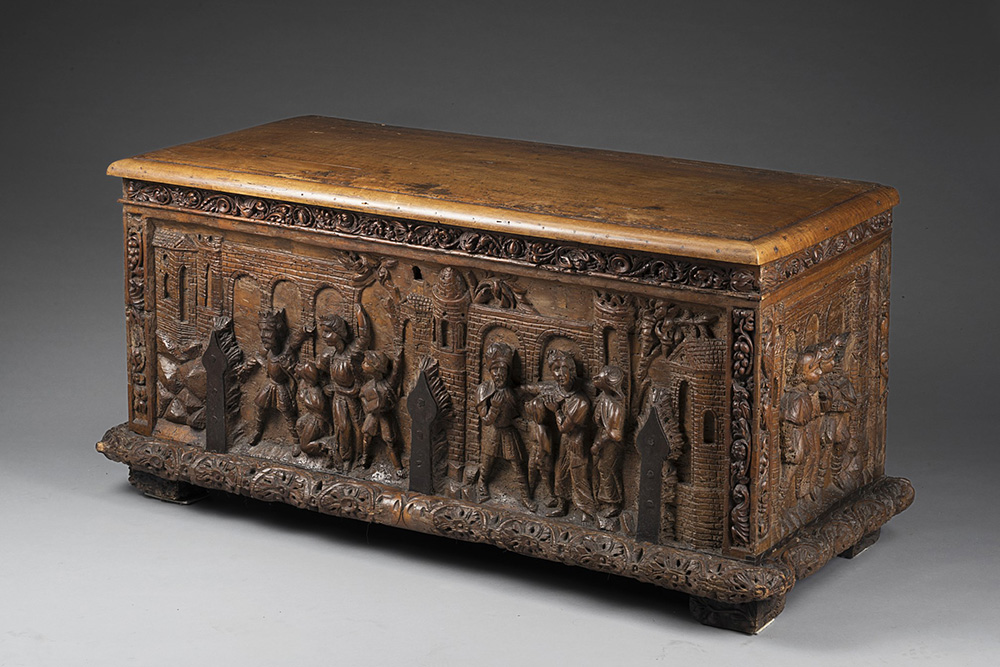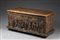 Antica cassapanca con fronte e fianchi scolpiti in altorilievo a scene di...
