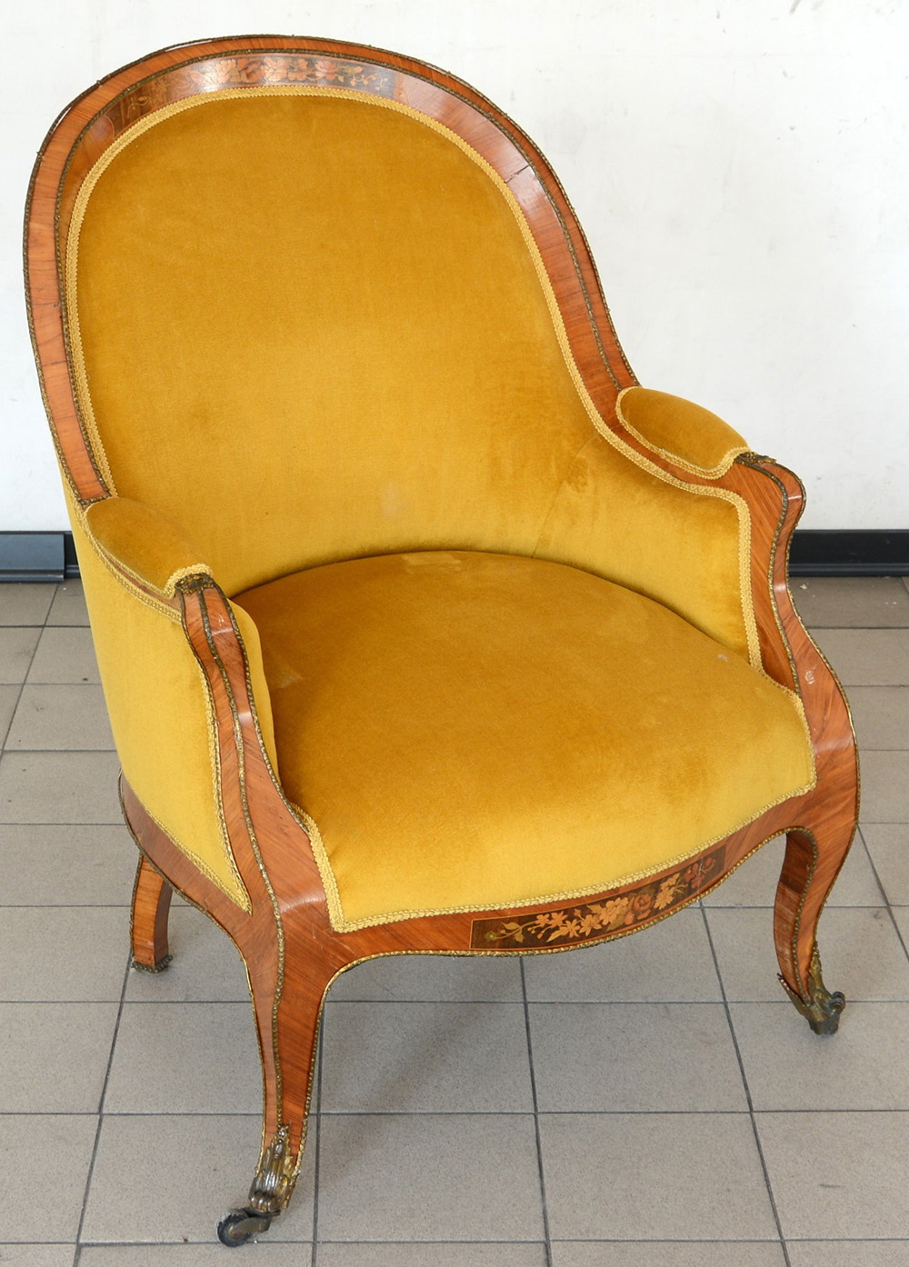 Poltrona con schienale intarsiato a motivi floreali. Fascia e montanti decorati da profili in metallo dorato. Piedi anteriori con scarpette in metallo munite di rotelle. Francia, sec. XIX