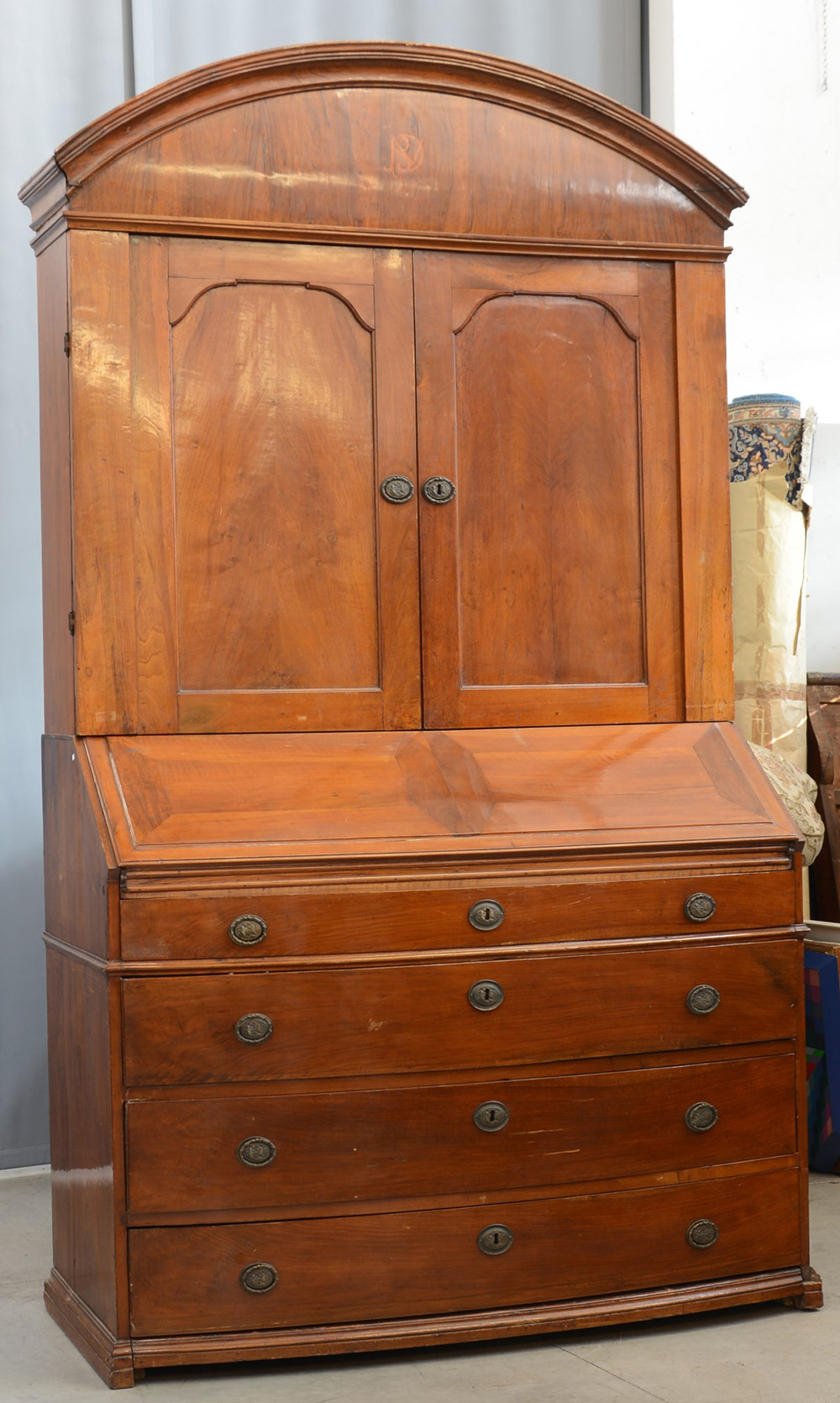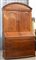 Mobile a due corpi in mogano, parte superiore a due ante e cimasa sagomata decorata la centro da monogramma, parte inferiore a finto cassetto nella fascia e tre grandi sagomati sul fronte. Inizio sec. XIX (cm 145x270x63)(difetti e restauri)
