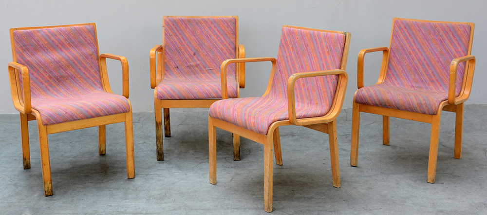 J.O. Carlsson Quattro sedie in legno massello di Betulla con seduta e schienale rivestito in tessuto rosa. Produzione Joc,Vetlandam Svezia, anni 70 (difetti)