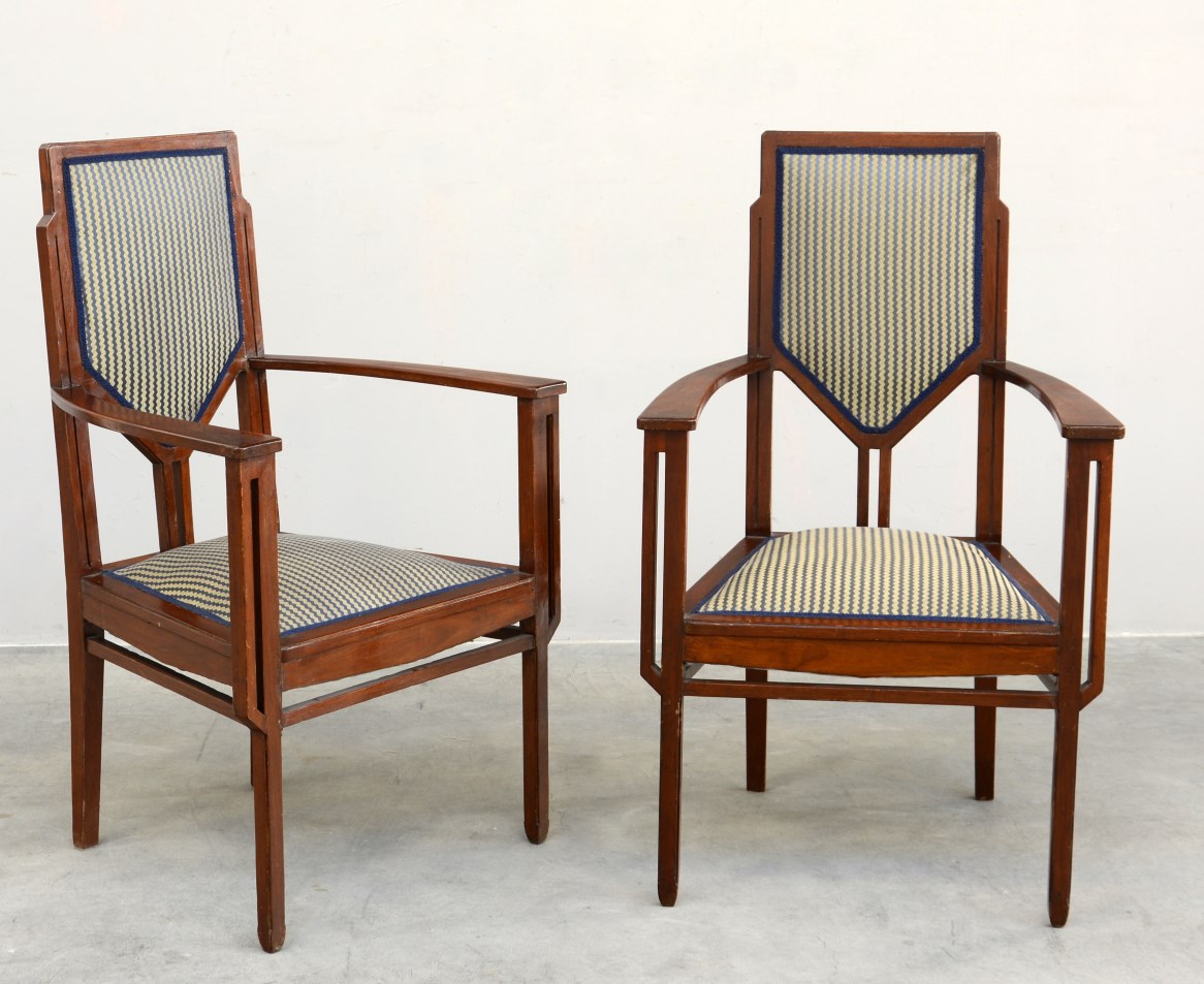 * Coppia di poltrone Liberty in noce massello con montanti e fasce scanalate,...