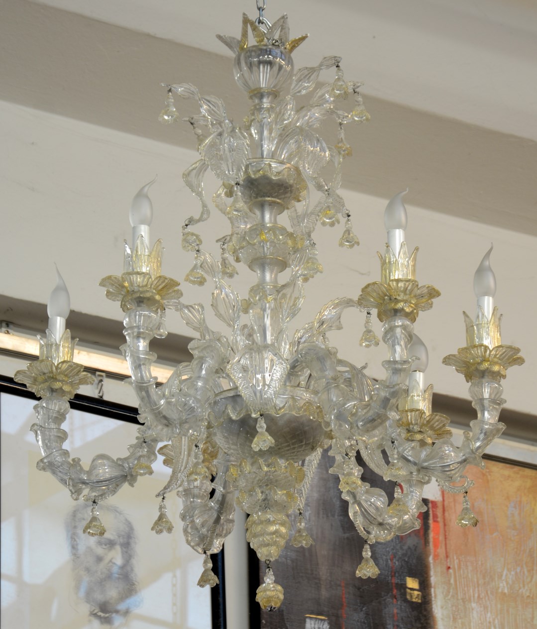 Manifattura di Murano. Lampadario in vetro soffiato incolore decorato da...