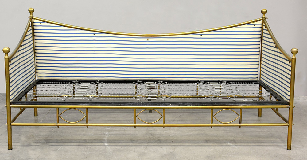 Divano a tre posti con struttura in ottone e pinnacoli torniti (cm 200x96x90) (difetti)