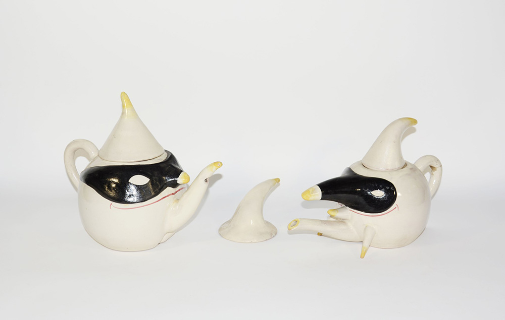 Manifattura Ceramica Solimene, Vietri sul Mare Due caffettiere in ceramica dipinta raffiguranti Pulcinella, unite a un coperchio analogo. Napoli, seconda met‡ sec XX (h max cm 27) (difetti)