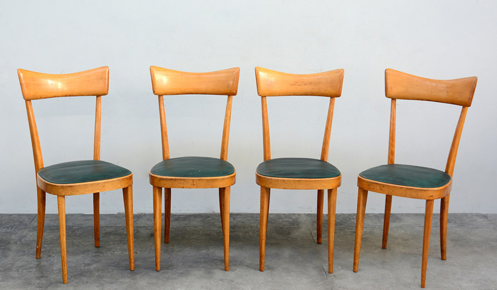 Gruppo di quattro sedie in legno di faggio chiaro con schienale curvato. Gambe tornite e sedute in skai verde. Marchio indecifrato sotto la seduta. Italia, sec XX (difetti)