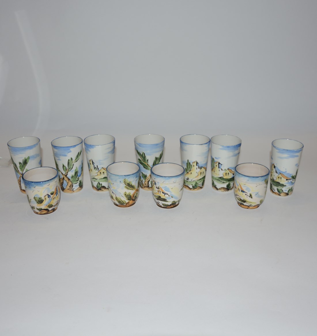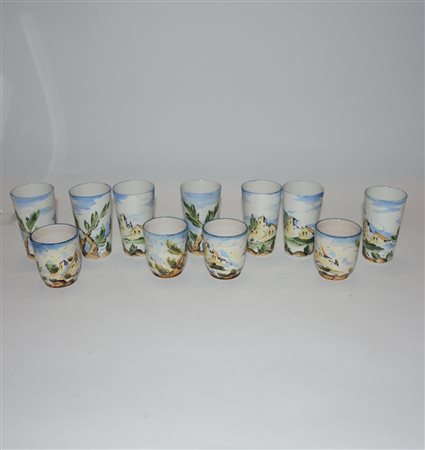 Lotto composto da undici bicchieri in ceramica di diversa forma, decorati in policromia a paesaggi, alcuni marcati MGA Albisola e alcuni siglati Locatelli. Sec XX (lievi difetti)