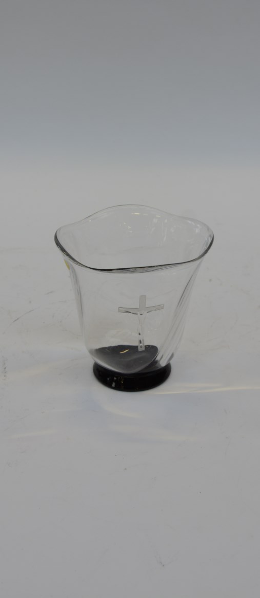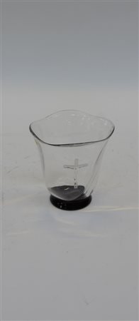 Orrefors Vaso in vetro incolore inciso al ruotino con figura di Cristo crocifisso. Firmato e numerato sotto la base. Svezia, sec XX (h cm 11)