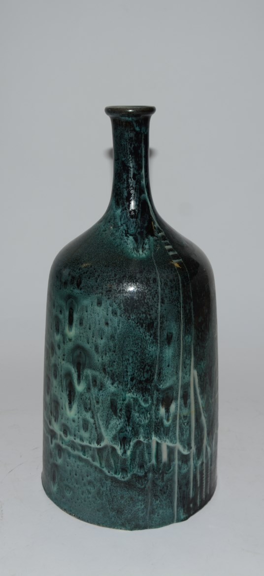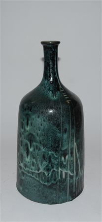 Bottiglia in ceramica decorata a colature nei toni del verde e del bruno. Italia, seconda met‡ del sec XX (h cm 43)