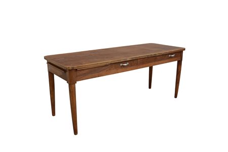 Scrivania in legno di noce massello e impiallacciato a due cassetti e un tiretto. Italia, anni 40 ca. (cm 190x80x73) (difetti)
