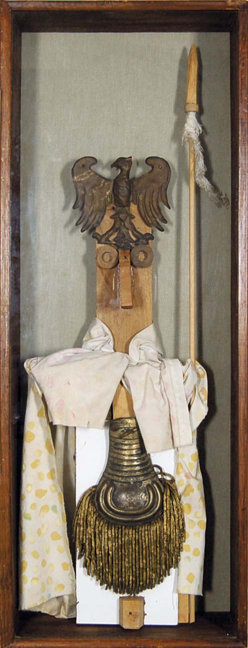 BAJ ENRICO Milano 1924 - Varese 2003 Agamennone 1987/88 scultura in legno con applicazioni entro teca Misure: 90x32x14 firma al retro autentica dell'Autore su foto