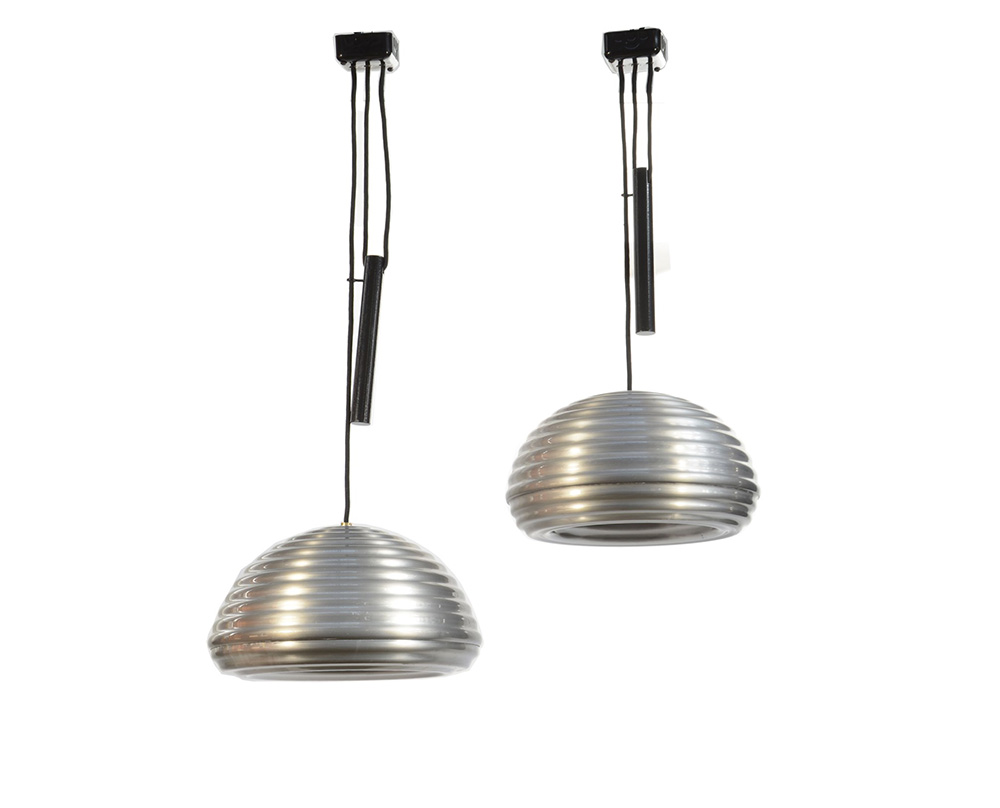 Achille Castiglioni (Milano 1918 - 2002) e Pier Giacomo Castiglioni (Milano 1913 - 1968) Coppia di lampade a sospensione modello "Splugen brau" con riflettore in alluminio tornito in lastra. Produzione Flos, Italia 1961 (d cm 30) (lievi difetti) Bibliografia: G. Gramigna, Repertorio del design italiano 1950-2000 per l'arredamento domestico, vol. 1, Allemandi Torino 2003, p 90