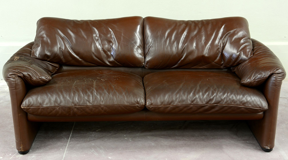 Vico Magistretti Milano (1920- Milano 2006) Divano a due posti modello "Maralunga". Produzione Cassina, 1973. Rivestimento in pelle marrone (cm 165x70x78) (difetti)